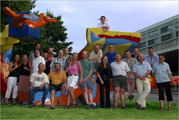 Gruppenphoto vor und auf Kunstwerk. Nie zovor hatten sich so viele Backgammon-Verrückte zur Party getroffen. 24 FIBSter aus 6 Nationen: Südafrika, USA,