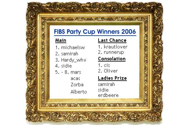 Die Gewinner des diesjährigen FIBS Party Turniers. Den Wanderpokal erhält michaelsw, der trotz seines Nachnamens "Schweizer" Deutscher ist