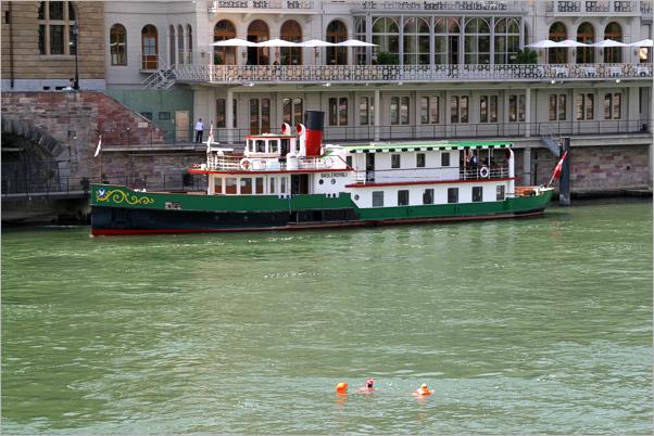 Schiffahrt und Schwimmen (die beiden Farbkleckse im vorderen Bildbereich) lassen sich am Oberrhein anscheinend noch vereinbaren. Bei weit über 30°C wagten sich sogar FIBSter in den Rhein. Leider ohne photographischen Beweis.