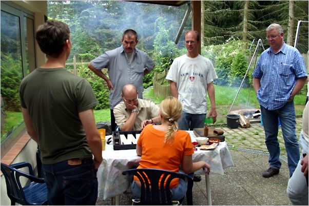 Auch während des Turniers war für das leibliche Wohl gesorg. Während Sixta_II und Peggels noch in der Vorrunde spielen, wird hinten bereits der Grill vorgewärmt. krautlover, Pernot_ricard, Zorba und houtx kibitzen.