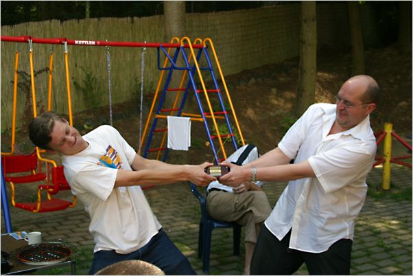 Aber auch nach krautlovers (links) Sieg im Finale ist der Kampf noch nicht ausgestanden: michaelsw will seinen geliebten FIBS-Party-Wanderpokal partout nicht loslassen