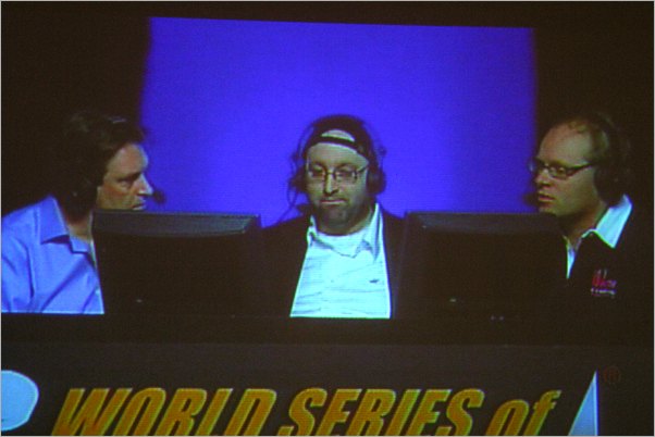 Das Kommentatorenteam während des Showmatches: John Clark (li.), Falafel (Mitte) und Mortel Holm. Während des anschließenden Finales nahm Gus Hansen die Stelle von Morten Holm ein.