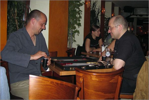 As friday was without tournament people were very relaxed .... and they got even more relaxed as the evening progressed (and the drink flowed)... here are Ramses (left) and michaelsw.