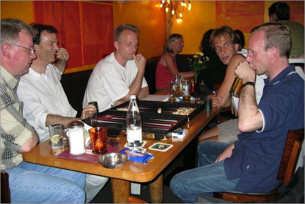 A large chouette : from left to right , houtx, Schigolch, BushSucks, erdbeere (in background), Noah and Paul_William (testing the typical cologne "Kölsch" beer)